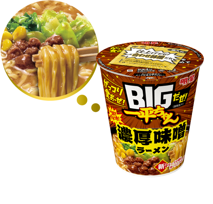 ガーリックをねり込んだスープがよく絡む食べ応えのあるフライ麺と、特製ガーリックオイルで仕上げる豚骨醤油スープが相性抜群のBIGサイズの一平ちゃん!