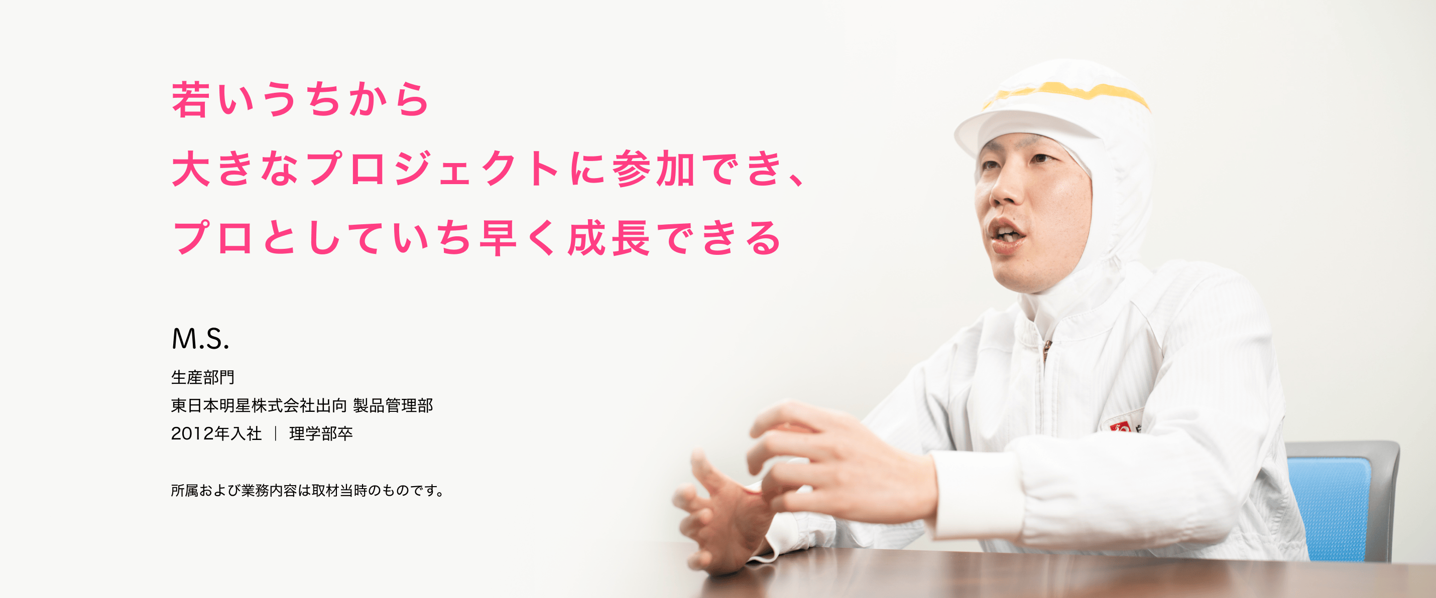 私は入社当時、一番に商品開発職をイメージして入社しましたが、実際は研究所の品質保証部に配属され、その後、製造工場の品質管理部に異動になりました。しかしながら、開発職では学べない分析方法の確立や、新ラインの立ち上げ、品質管理部分析部門の統括(マネージメント)等の様々な経験をすることができました。そのため、就活生には、内定をとることだけを考えるのではなく、なりたい自分になるためにどのような経験をすべきか、そのためにどのような企業に入るべきかを視野に入れて就活を頑張ってもらいたいと思っております。その中に明星食品があれば、うれしく思います。皆様にお会いできることを楽しみにしています。