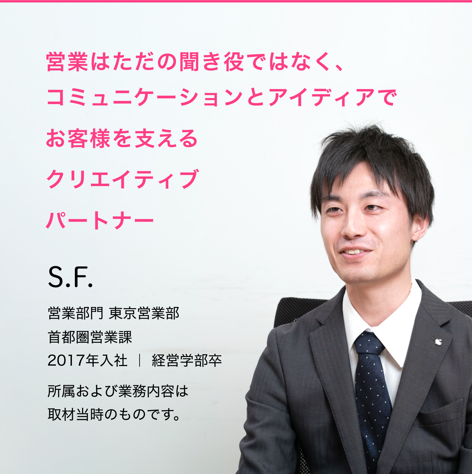 お得意先様の課題を解決するようなアイディアや企画を提案します。独りよがりの提案ではなく、常に「これは本当のお得意先様のためになる企画なのか」と自問自答を繰り返し、お得意先様目線に立った提案をするように目指しています。
