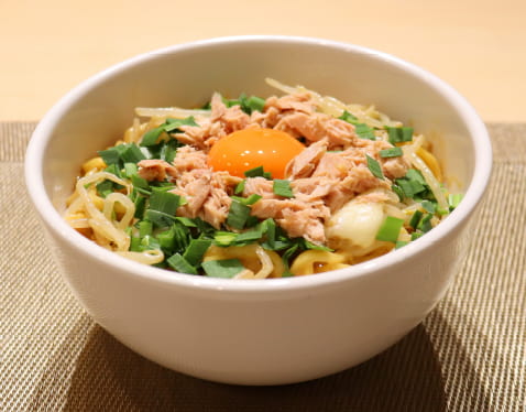 もっちり麺と具材のもやし1袋とツナ缶1缶でボリュームのある濃厚汁なしメニュー