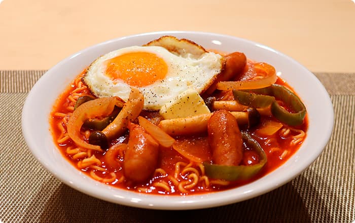 火を止め、器に盛り付け、キムチ、卵をトッピングしたらできあがり。