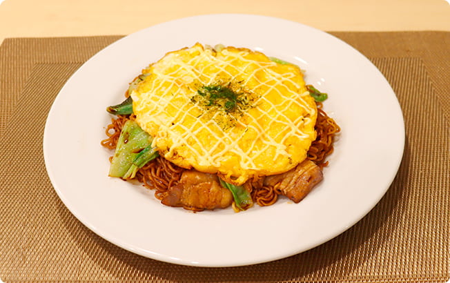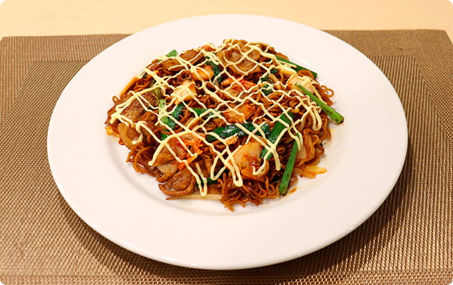 水気が完全になくなる手前で夜店ソースを加えてめんとよく混ぜ、しっかり炒めて皿に盛り付ける。